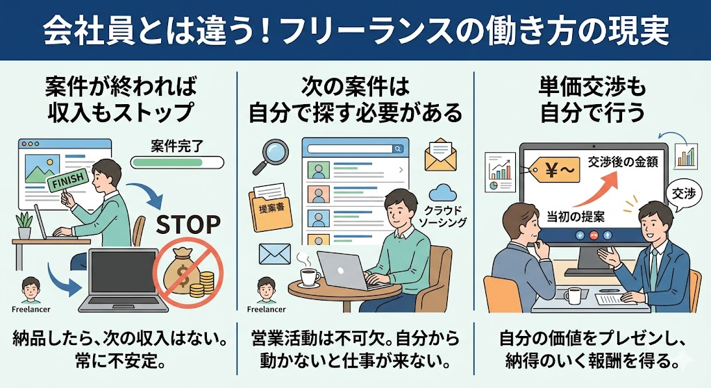 現実は案件をこなして、営業 or 紹介してもらないと稼げないのがフリーランスです。