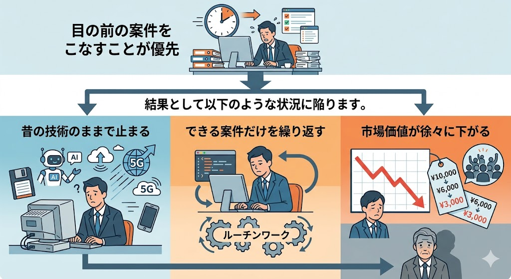 目の前の案件をこなすことが優先になり、新しいスキルの習得がおろそかになるからです。