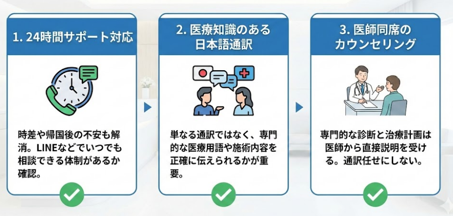 日本人である医師・看護師がカウンセリングを含めて、サポートしてくれます。
