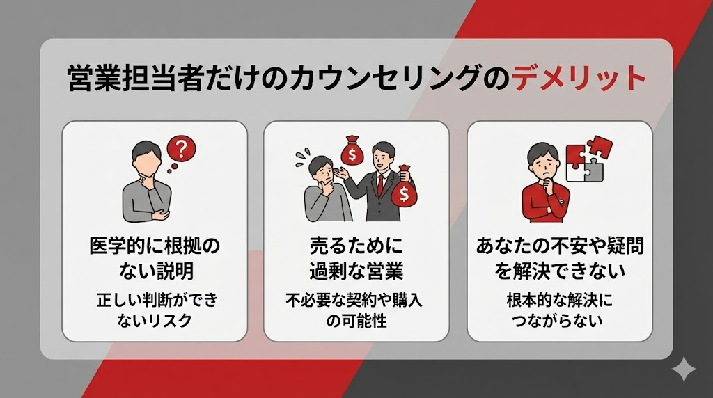 営業担当者だけのカウンセリングだと、以下のようなデメリットがあるからです。