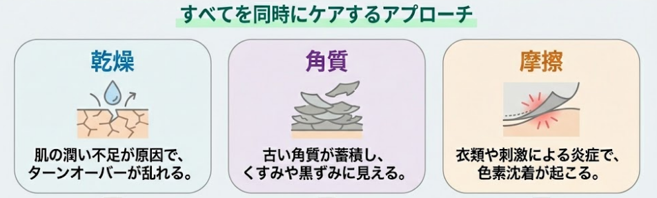乾燥している状態だと【摩擦】によって色素沈着が進みやすくなるからです。