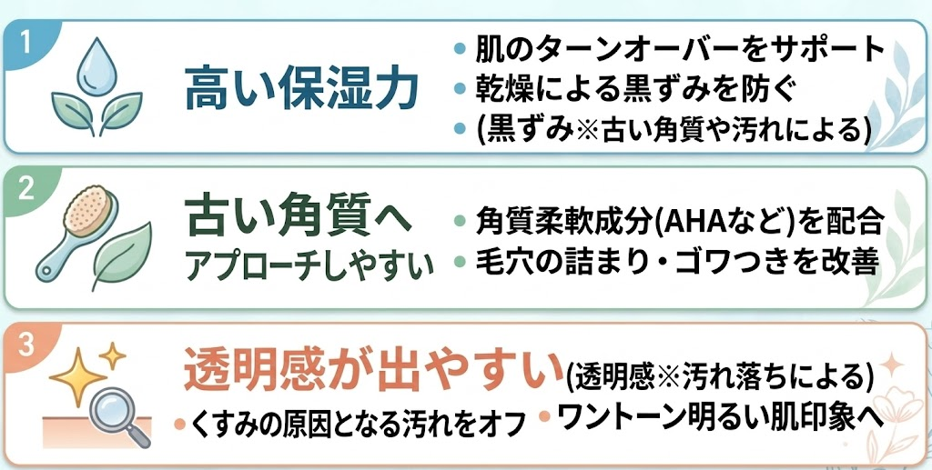 一般的なスクラブとは違い「黒ずみ・ザラつき・くすみ」など、複数の悩みにアプローチできます。