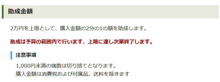 三鷹市では購入額の2分の1(最大2万円)の助成金が出ます。