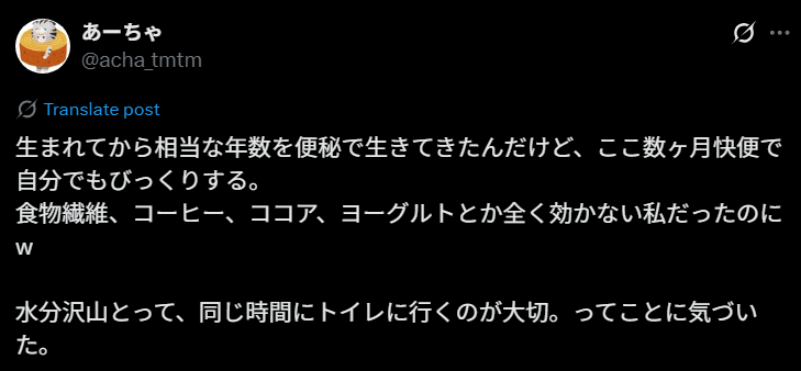 先ほどのネットの意見にもあったように、水分は便を出すうえで大切なポイントの1つ。