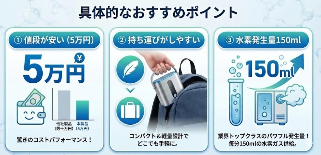 →値段が一番安い+水素を吸えるだけで良い+持ち運びもできる