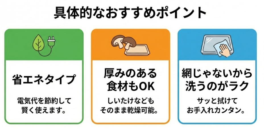 | どんな人に向きか | コスパを重視したい | 厚みがあるのを乾燥させたい | 業務で活用したい |