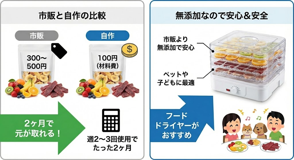 ただ、市販のドライフルーツやジャーキーは300~500円ですが、自作すれば100円(材料費)で作れます。