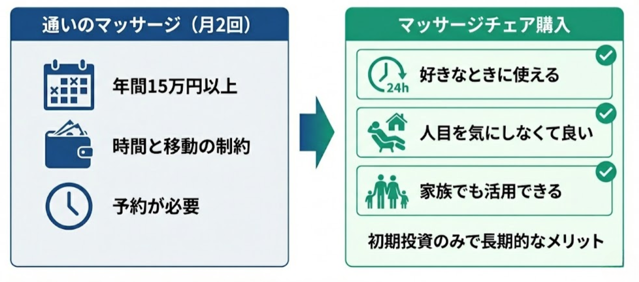 実際には【整体】や【マッサージに通い続ける】より、コスパは良いです。
