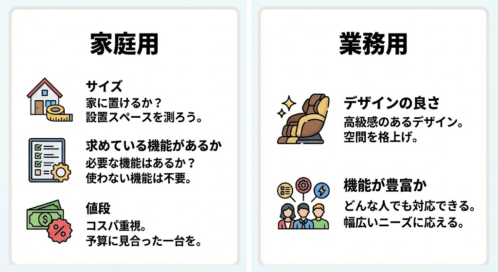 上記のようにあなたがなぜマッサージチェアが欲しいかで重要なポイントは異なります。