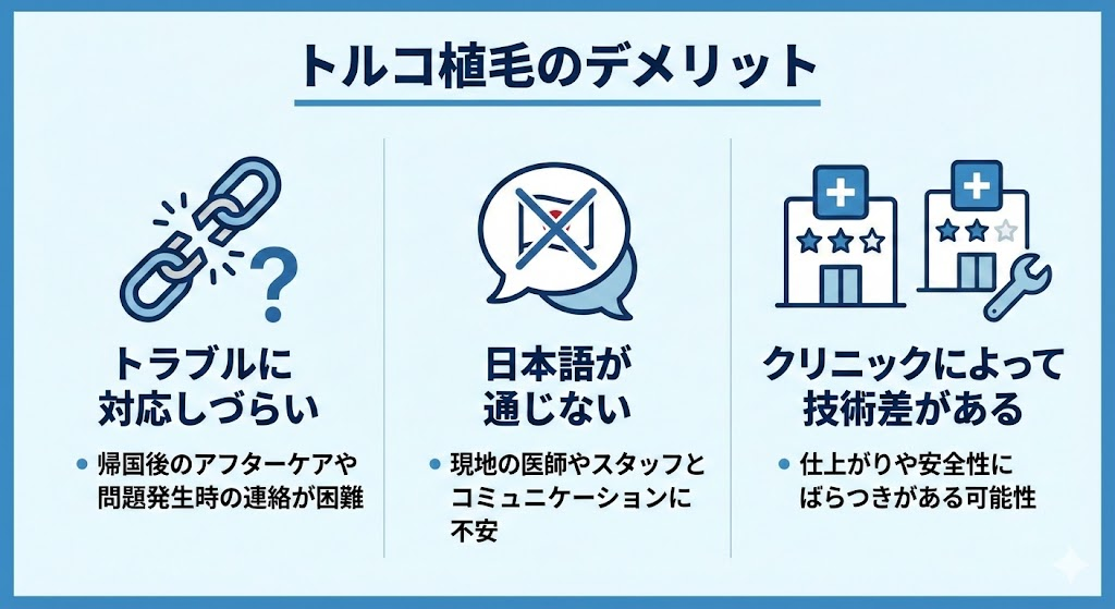 トルコ植毛の大きなメリットは価格の安さと技術力ですが、当然ながらデメリットも存在します。