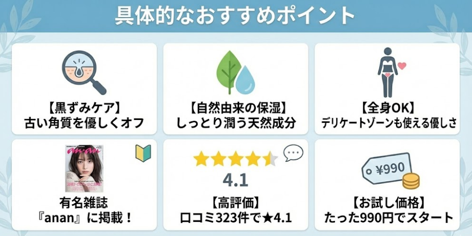 | 特徴 | 値段~性能まで文句なし →肘の黒ずみで迷ってるなら間違いなし |