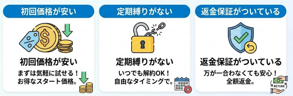 実際に使わないと肌に合うかわからないので、最初にかかる費用やリスクの低さは重要なポイントです。