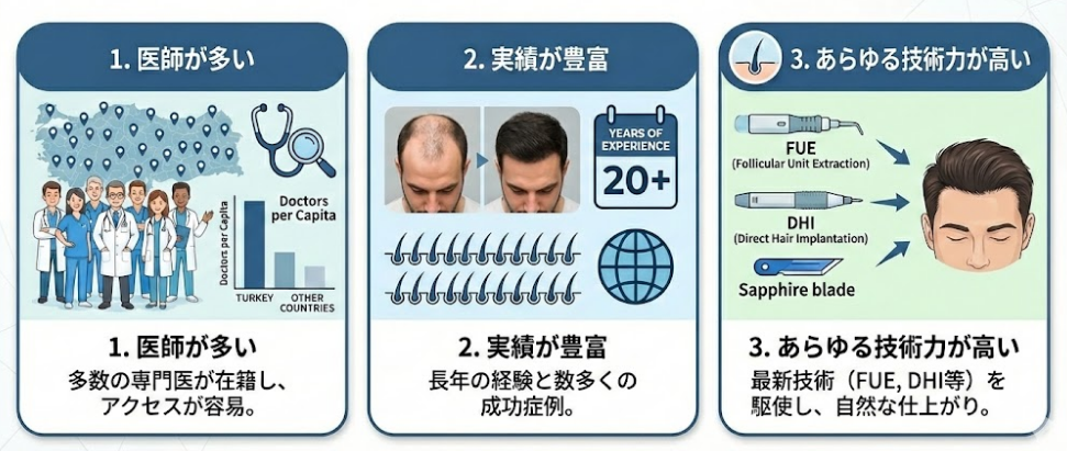 トルコでは以下のように植毛に関してほかの国より優れています。