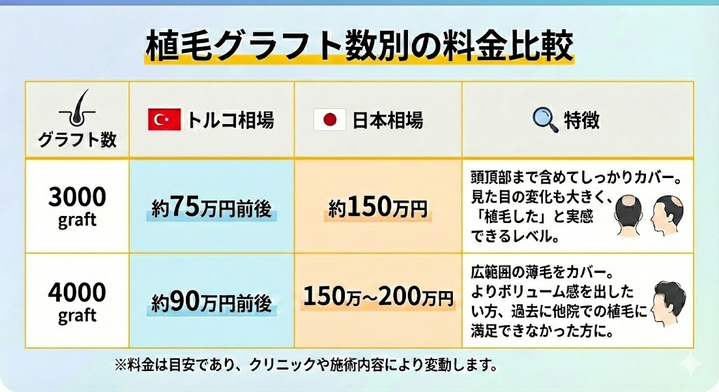 日本では3000graftの施術で150万円ほどかかることが多いですが、トルコなら同じ本数で約75万円。